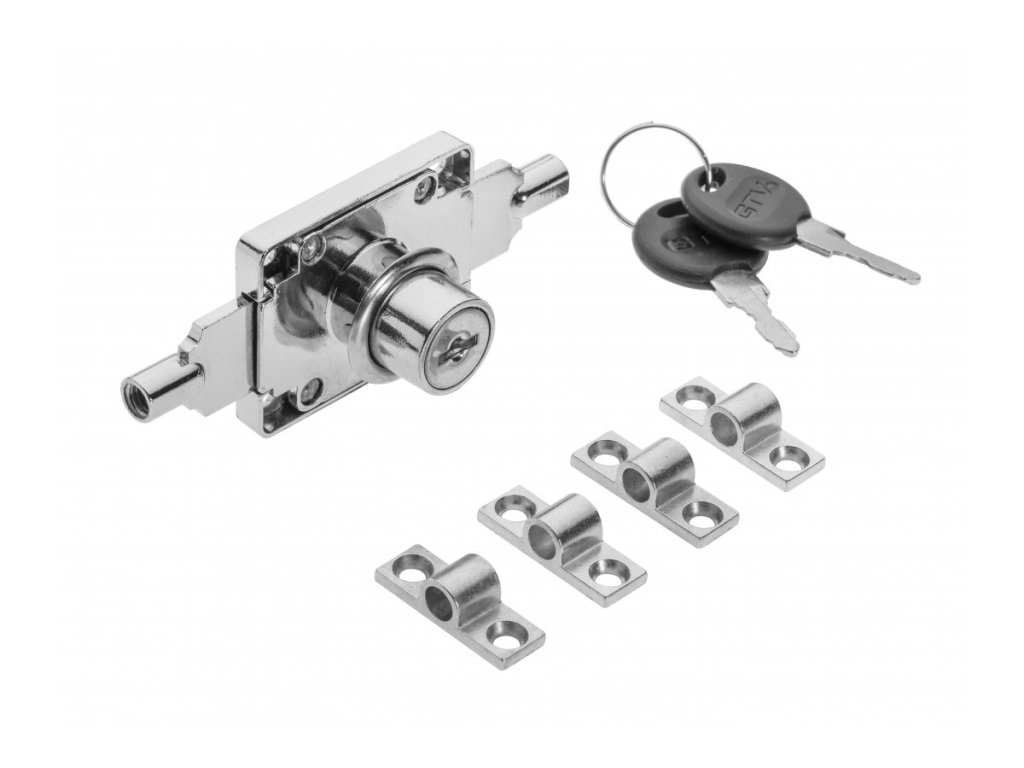 Chrómovaný zámok zapustený s rozetami. Určený pre vysoké, jednokrídlové alebo dvojkrídlové čelá. Sada obsahuje dva oceľové kľúče, štyri vodiace lišty tyče a jednu rozetu, dve tyče ZZ-BA-SK0-PR. Otočením kľúča sa tyče uvoľnia súčasne z oboch strán, vysunú a zaistia do predvŕtaných drážok v korpuse nábytku.