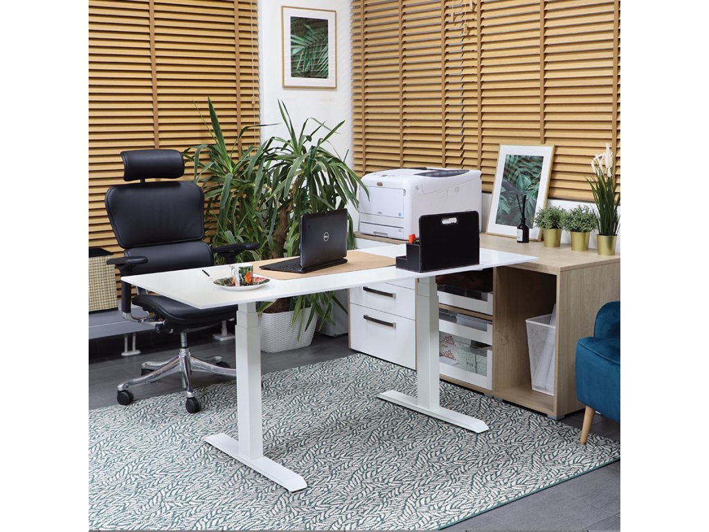 Elektrický rám Futuro sa odporúča pre tradičné kancelárske priestory, konferenčné miestnosti, ale aj detské izby a domáce kancelárie. Umožňuje plynulé nastavenie výšky dosky stola v rozmedzí 625–1275 mm, čím sa prispôsobí preferenciám a aktuálnym potrebám osoby, ktorá pri ňom sedí. Ak chcete pracovať v stoji, sedieť na lopte nižšej ako stolička alebo zdieľať stôl so svojím dieťaťom, prispôsobenie pracovného priestoru trvá doslova chvíľu. Dosku stola môžete spustiť alebo zdvihnúť pomocou ľahko použiteľného ovládacieho panela – stačí stlačiť príslušné tlačidlo a hotovo. Presná výška dosky stola sa zobrazuje na paneli. Do systému môžeme tiež zadať 4 obľúbené polohy. Bezpečnosť zabezpečuje špeciálny mechanizmus, ktorý zastaví pohyb, keď senzor zistí prekážku. Futuro je k dispozícii v troch farbách – bielej, čiernej a striebornej. Vďaka nastaviteľnej šírke (od 1075 do 1800 mm) je možné ho vybaviť doskou stola s maximálnymi rozmermi 1000x2000 mm, ktorú je možné zakúpiť samostatne.