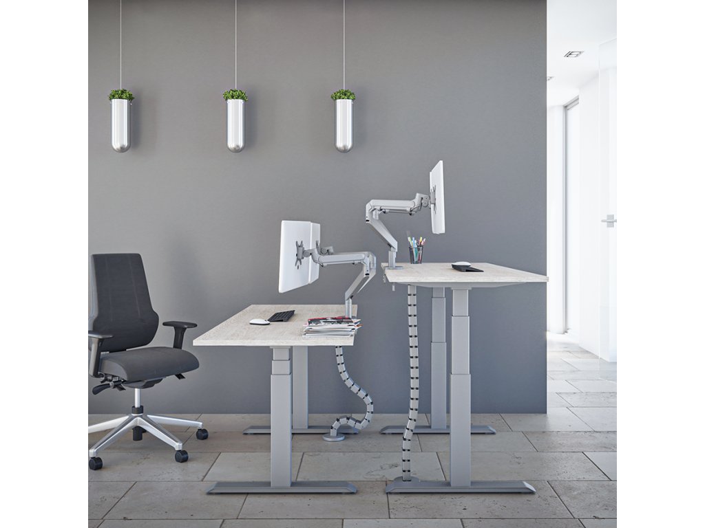 Elektrický rám Futuro sa odporúča pre tradičné kancelárske priestory, konferenčné miestnosti, ale aj detské izby a domáce kancelárie. Umožňuje plynulé nastavenie výšky dosky stola v rozmedzí 625–1275 mm, čím sa prispôsobí preferenciám a aktuálnym potrebám osoby, ktorá pri ňom sedí. Ak chcete pracovať v stoji, sedieť na lopte nižšej ako stolička alebo zdieľať stôl so svojím dieťaťom, prispôsobenie pracovného priestoru trvá doslova chvíľu. Dosku stola môžete spustiť alebo zdvihnúť pomocou ľahko použiteľného ovládacieho panela – stačí stlačiť príslušné tlačidlo a hotovo. Presná výška dosky stola sa zobrazuje na paneli. Do systému môžeme tiež zadať 4 obľúbené polohy. Bezpečnosť zabezpečuje špeciálny mechanizmus, ktorý zastaví pohyb, keď senzor zistí prekážku. Futuro je k dispozícii v troch farbách – bielej, čiernej a striebornej. Vďaka nastaviteľnej šírke (od 1075 do 1800 mm) je možné ho vybaviť doskou stola s maximálnymi rozmermi 1000x2000 mm, ktorú je možné zakúpiť samostatne.