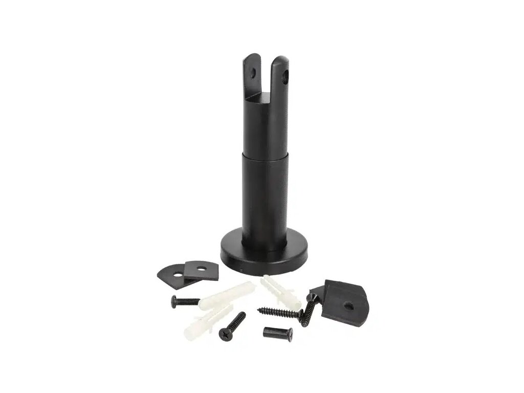 Podporná noha panelu 117–175 mm, panel F/10–18 mm, čierna povrchová úprava, SS304 pre toaletné kabíny, vrátane čiernych plastových podložiek F/ 10, 13 a 16 mm hrúbka panelu. 2 x 2 mm, 1 x 3 mm a 2 x 4 mm