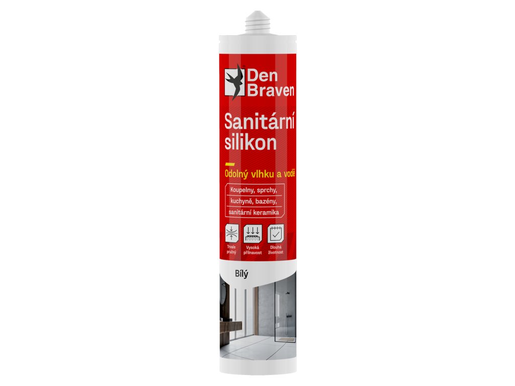 Sanitárny silikón DEN BRAVEN 280 ml biely. Jednozložkový acetátový silikónový tmel. Vytvrdzuje pri kontakte so vzdušnou vlhkosťou, vytvára trvale pevný, elastický spoj. Tesnenie sanitárnych a kuchynských zariadení vrátane odpadov, drezov, liatinových kúpeľňových vaní, nádrží, sanitárnej keramiky, obkladov a pod.