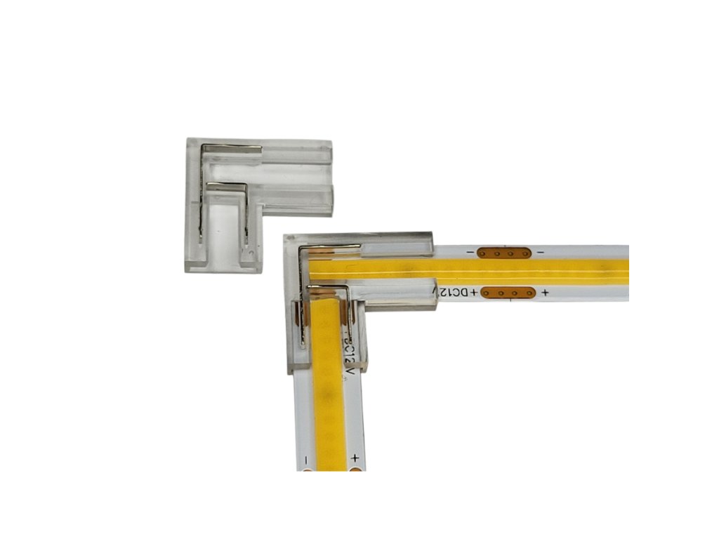LED R2 - rýchlospojka pre rohové spojenie LED pásov 8 mm. Montáž na LED pás sa realizuje zasunutím pásu do rýchlospojky a stlačením kovových častí spojky kliešťami. Výhodou je transparentné prevedenie, vďaka ktorému je spoj priehľadný a po rozsvietení pásu nie je spoj viditeľný (svetelná línia nie je prerušená spojkou).