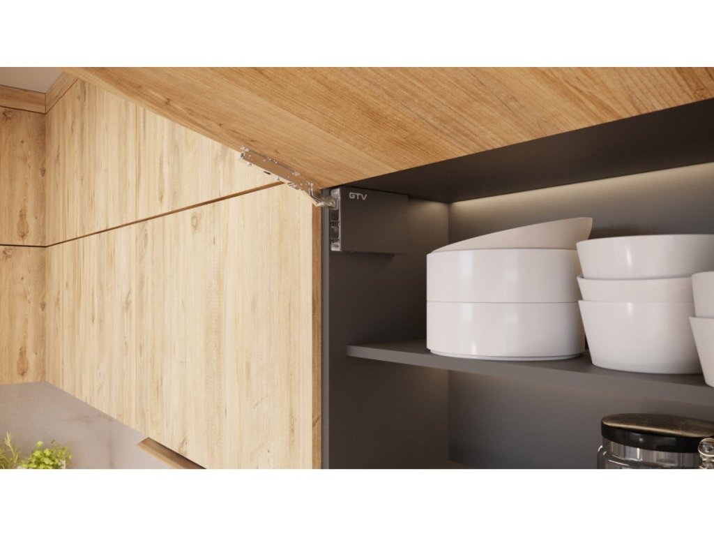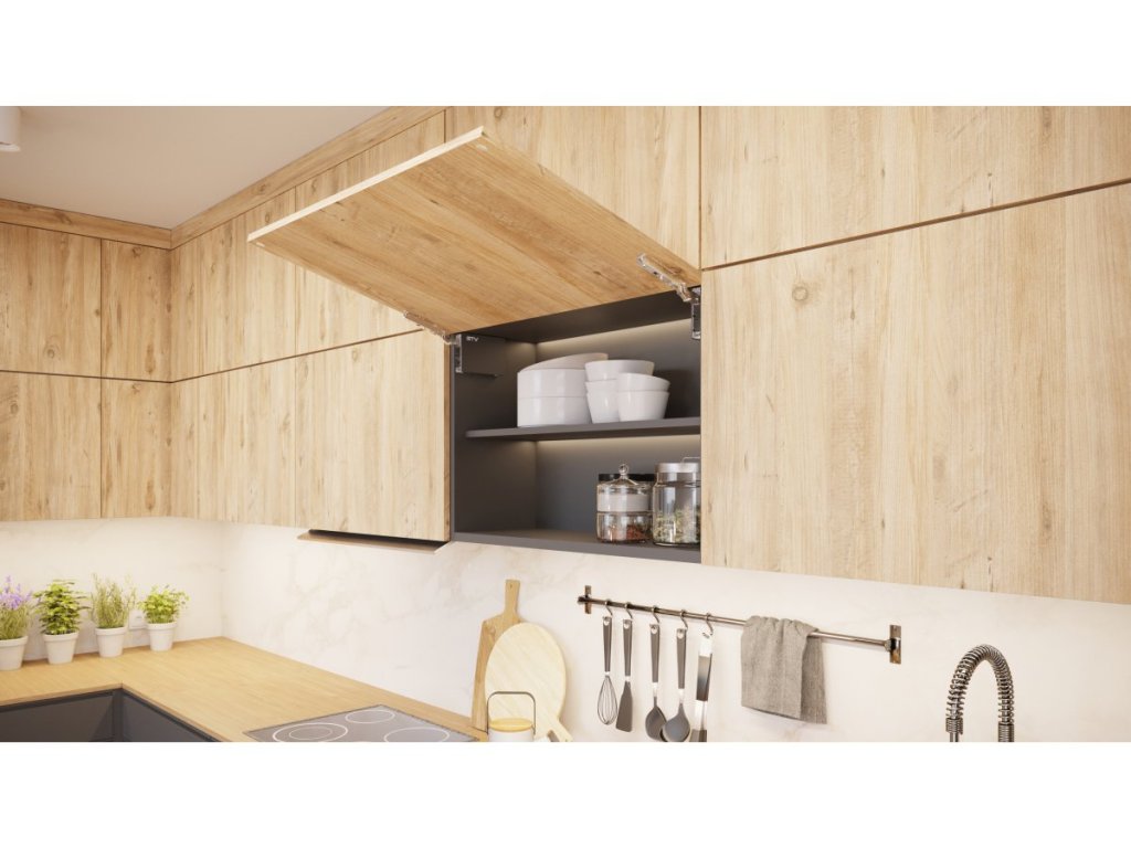 Výklopné kovanie GTV HORIZON, výška čela 350-650 mm, hmotnosť čela 4,5-10 kg, sila 2000-4050. Farba krytu: antracitová. Tento mechanický zdvihák uľahčuje navrhovanie funkčných a moderných horných skriniek. Zaisťuje plynulý pohyb a tlmenie pri zatváraní skriniek. Umožňuje zastaviť veko v ľubovoľnej polohe nastavenej používateľom. Má tri možnosti nastavenia: ovládacia sila, čas zatvárania a uhol otvorenia od 90° do 105°. Zdvihák je vhodný pre veká s výškou od 300 mm do 650 mm. Výber zo štyroch možností sily pružiny, prispôsobených výške a hmotnosti čela, umožňuje širokú škálu aplikácií. K dispozícii sú tri farebné možnosti krytu: biela, antracitová a čierna. Jednoduchá inštalácia bez potreby ďalších šablón alebo meraní, pretože dizajn zdviháka slúži aj ako jeho montážna šablóna.