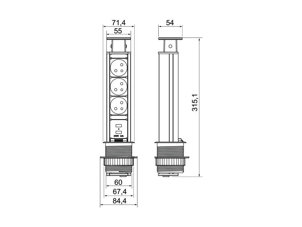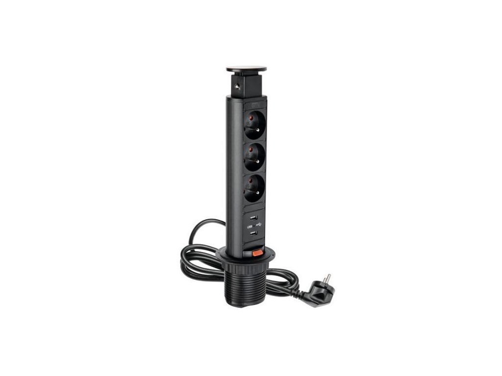 Výsuvná nábytková zásuvka je jedným z najpopulárnejších riešení na trhu. Je prispôsobený malým priestorom – malé písacie stoly, stolíky, kuchynské linky. Po vysunutí máme k dispozícii tri napájacie zásuvky. Zásuvka je ukončená estetickým krytom. Dostupné v dvoch univerzálnych farbách: čiernej a striebornej. Úspora miesta – keď skončíte, môžete ho jednoducho schovať do pracovnej dosky. Malý rozmer - pre montáž stačí vyvŕtať otvor s priemerom len 60 mm. Jednoduchá inštalácia - montáž do pracovnej dosky sa vykonáva utiahnutím plastovej matice. Zariadenie je dodávané so 150 cm dlhým napájacím káblom.