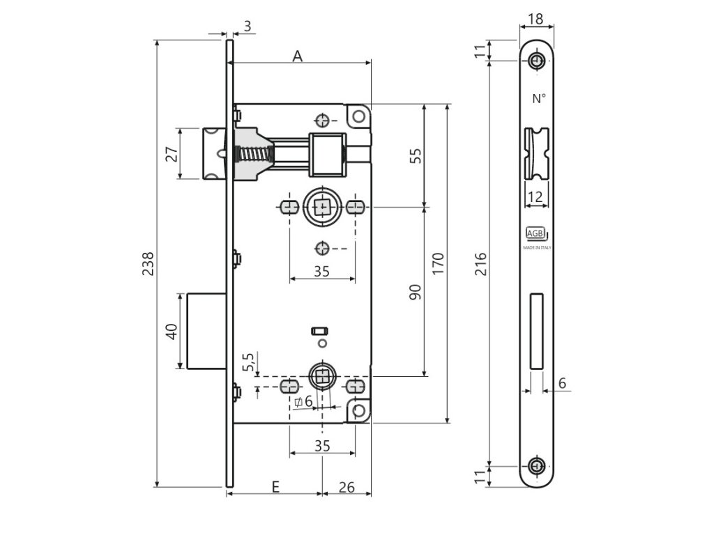 Zadlabávací zámok AGB zámok WC, rozteč: 90mm, šírka zámku 75mm, dormas: 50mm, čelo:18mm , Povrchová úprava: biely zinok.
